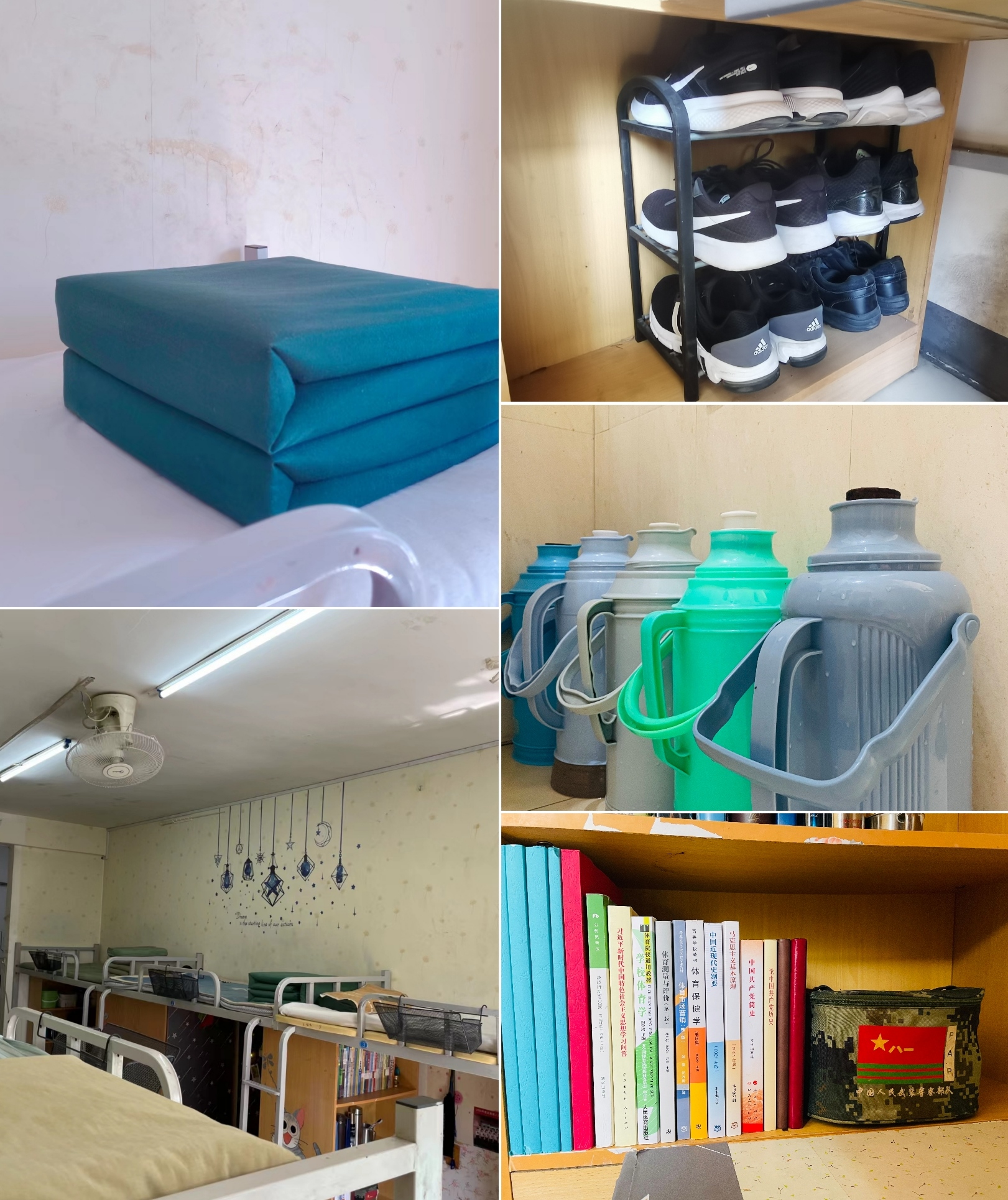 宿舍成员:张斌,2017年入伍,2019年复学到体育专19-1班,服役于中国人民解放军陆军;余绍生,2018年入伍,2020年复学到体育19-1班,服役于武警北京总队;杨华成,2018年入伍,2020年复学到社体19-1班,服役于中国人民解放军陆军;卢鑫,2018年入伍,2020年复学到社体19-1班,服役于中国民解放军空军;焦偓海,2018年入伍,2020年复学到体育专20-1班,服役于武警山西总队。战友间的革命情谊让他们有缘相遇,和其他宿舍不同,241宿舍实行“军事化”管理,脱下军装,他们与普通员工没什么两样,但正襟危坐的姿势,黝黑刚毅的脸庞是部队给予他们不同于其他同学的历练。
