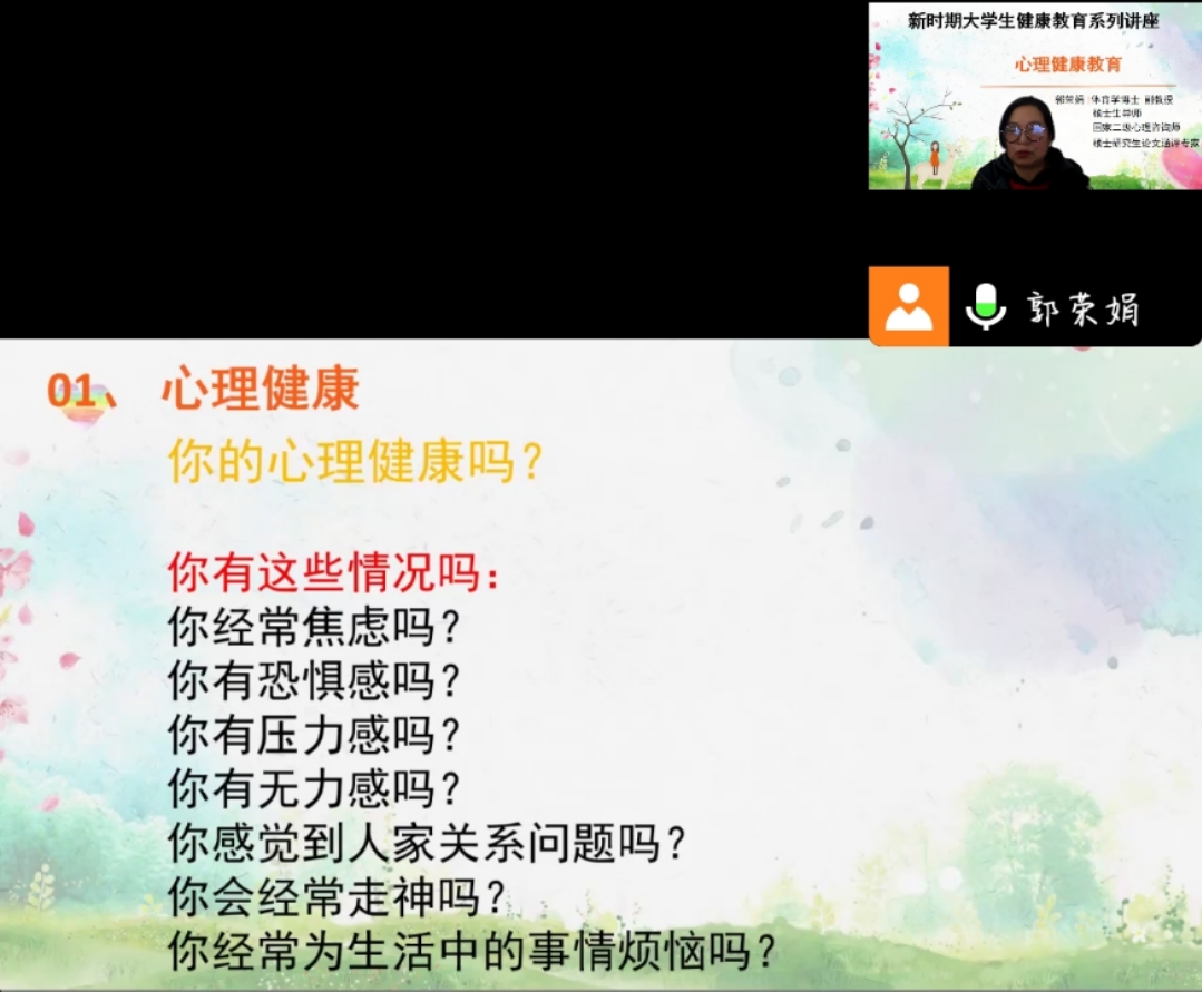 为进一步加强现阶段员工心理健康教育工作的针对性和有效性,及时纾解情绪,引导同学们以积极向上的心态进行自我防护,做好自身健康第一责任人。国家二级心理咨询师、伟德国际1949官网馨灵驿站郭荣娟老师于12月10日晚6:30,通过腾讯会议组织大一、大二员工开展新时期老员工心理健康教育系列讲座。