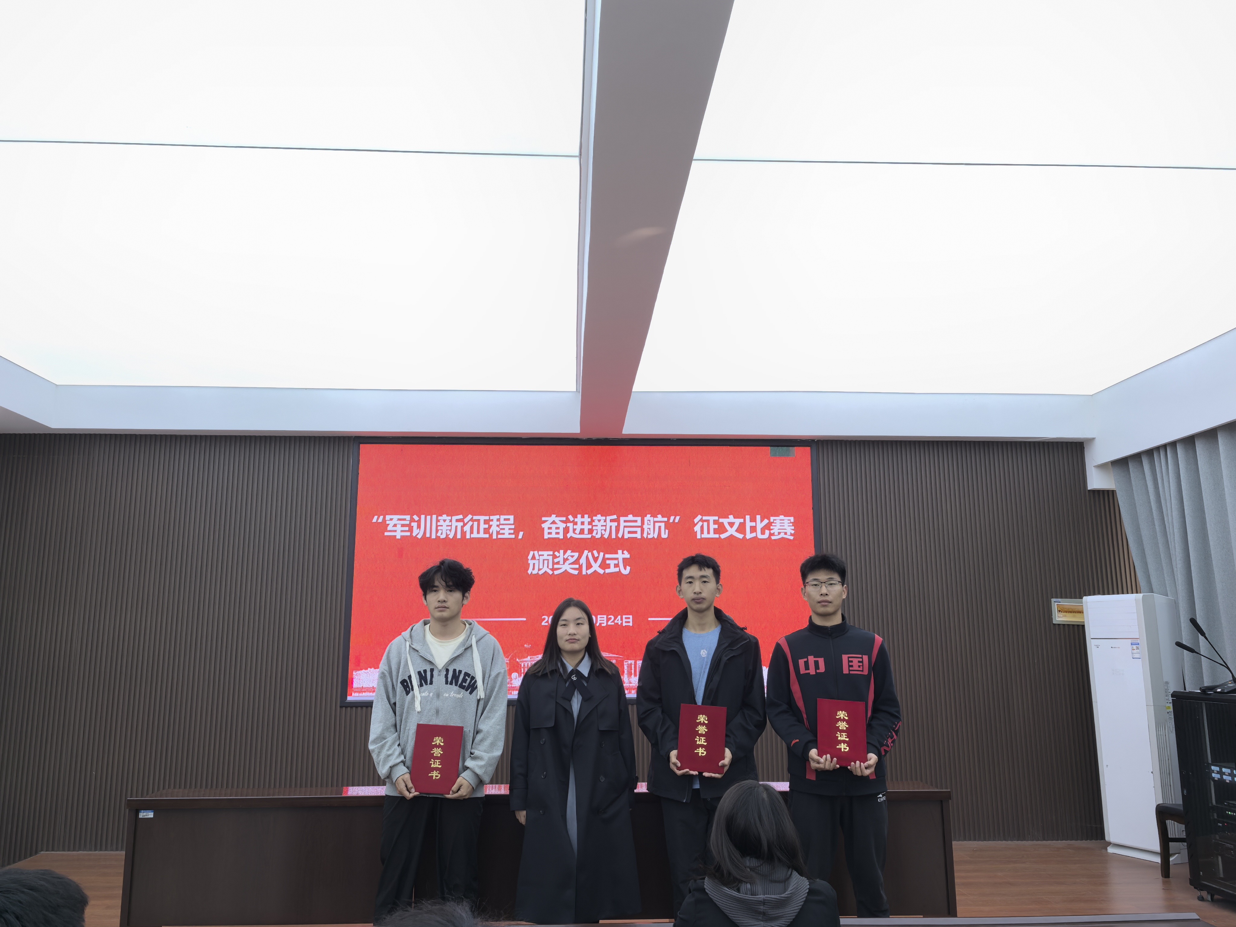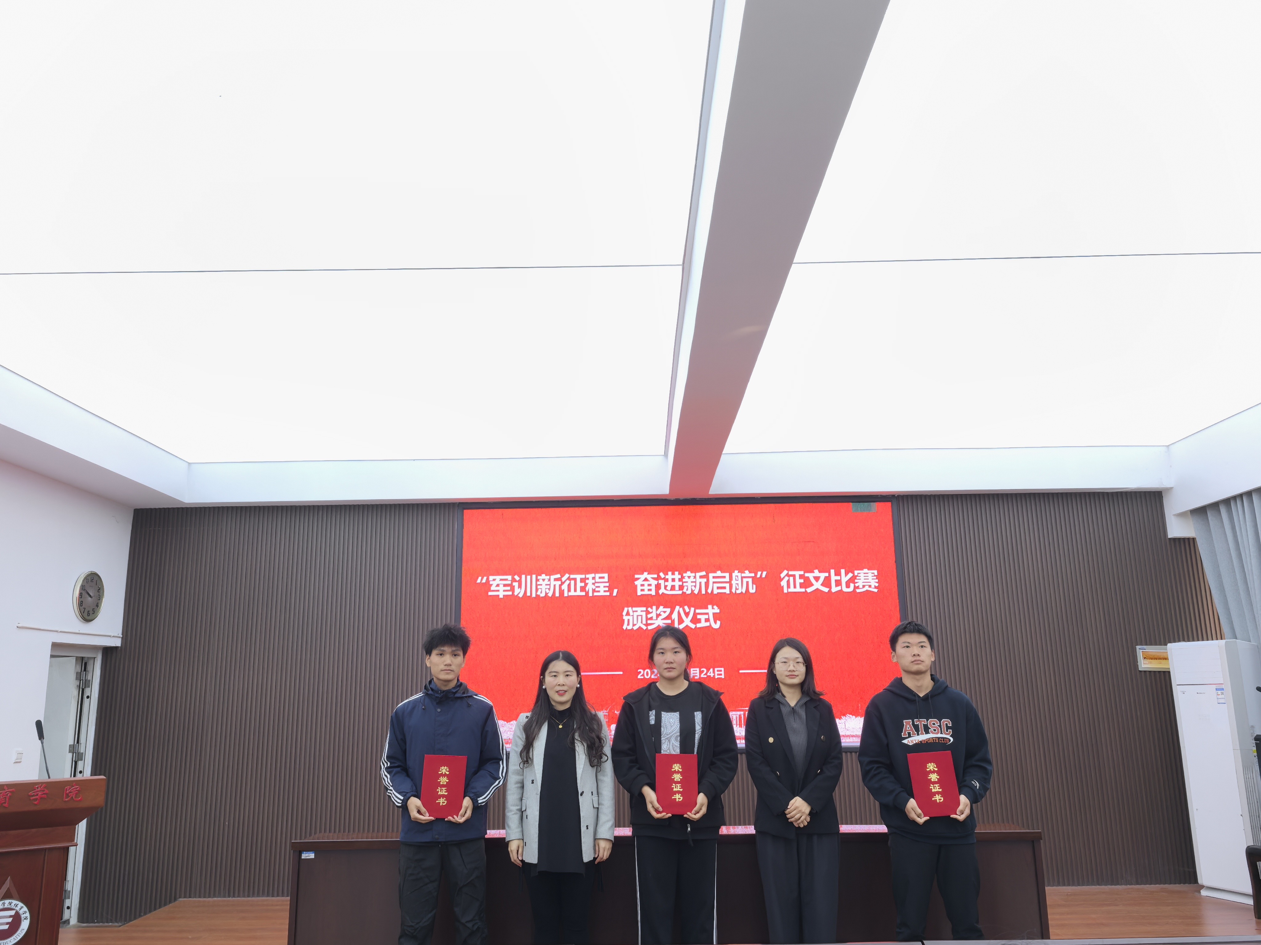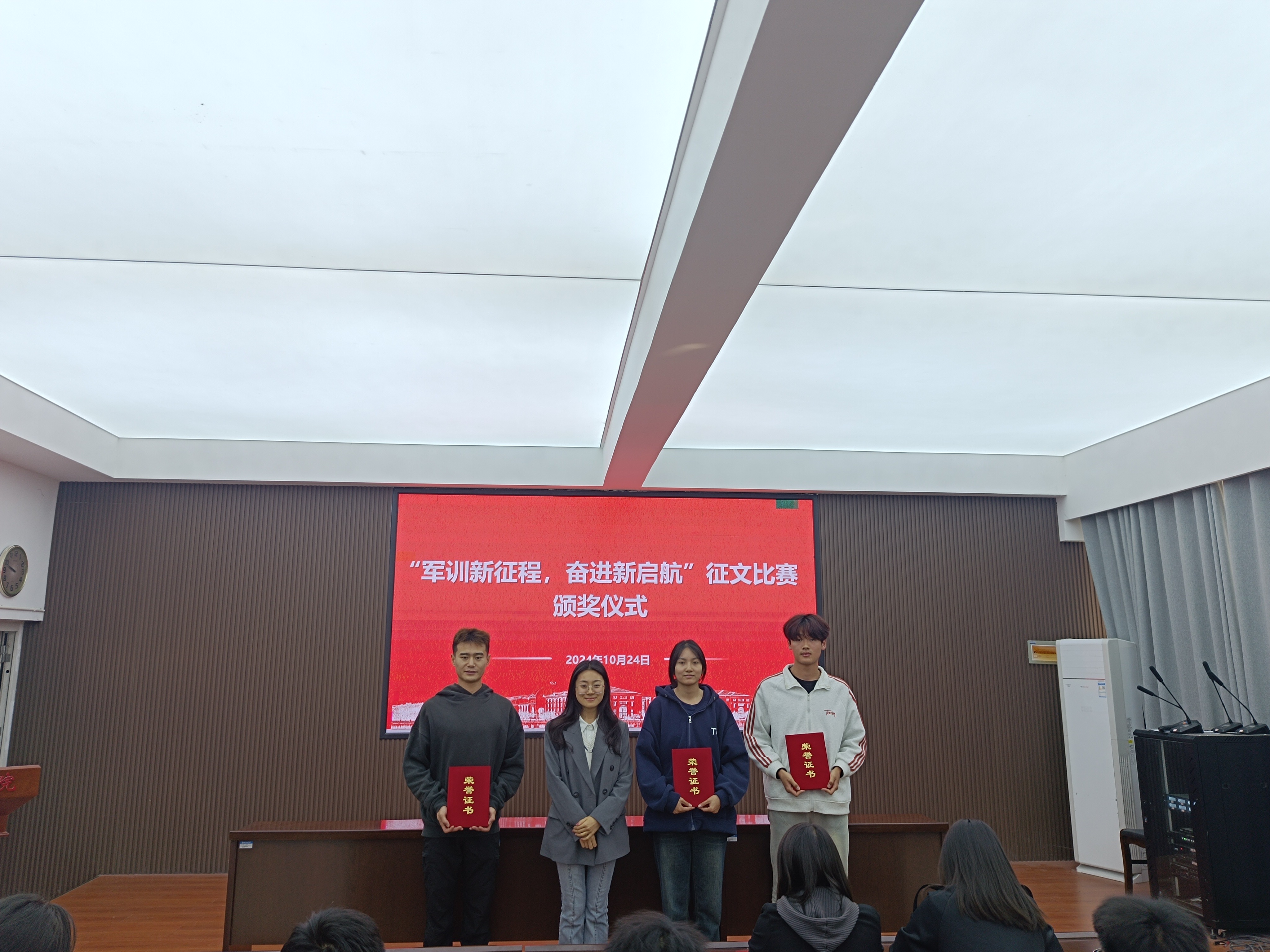 10月24日,伟德国际1949官网在121会议室举办“军训新征程,奋进新启航”第二届征文比赛颁奖仪式。此次活动旨在表彰在军训期间通过文字记录成长历程、展现青春风采的优秀学子。伟德国际1949官网团委书记杨冉冉、员工工作办公室主任孙烨以及辅导员王艳利老师、孙亚翡老师出席了颁奖仪式。活动由杨冉冉老师主持。