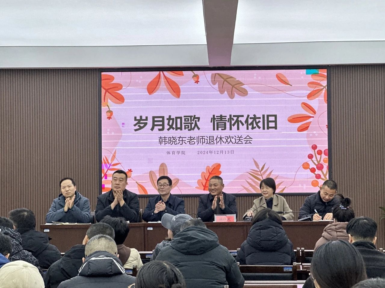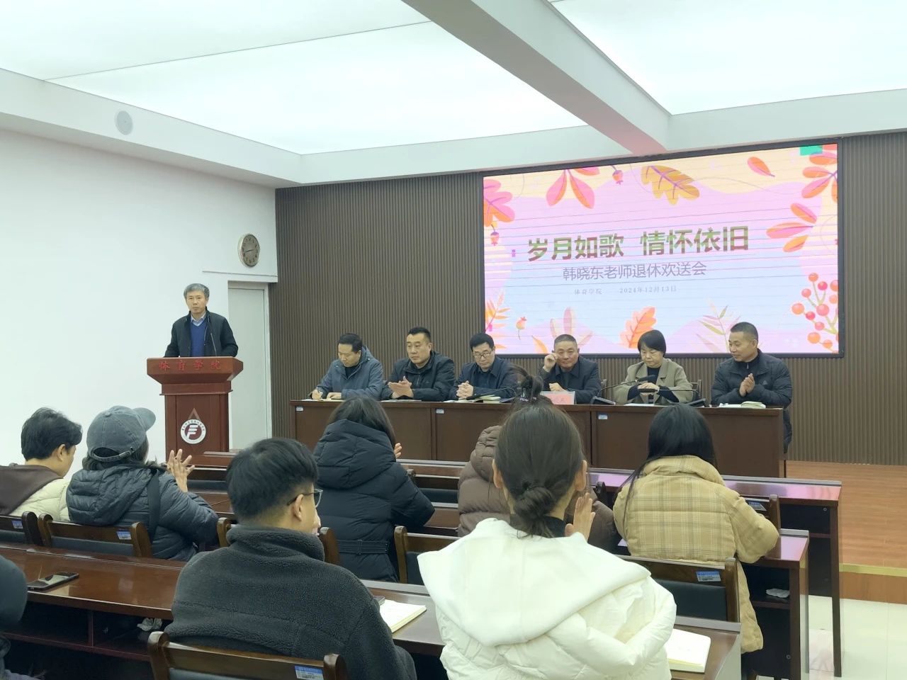 韩晓东老师在欢送会高潮部分发表了感言,回顾了自己的教员工涯,表达了对学院和同事们的深厚感情。他感谢大家的关心和支持,并表示虽然即将退休,但仍会关注和支持学院的发展。
