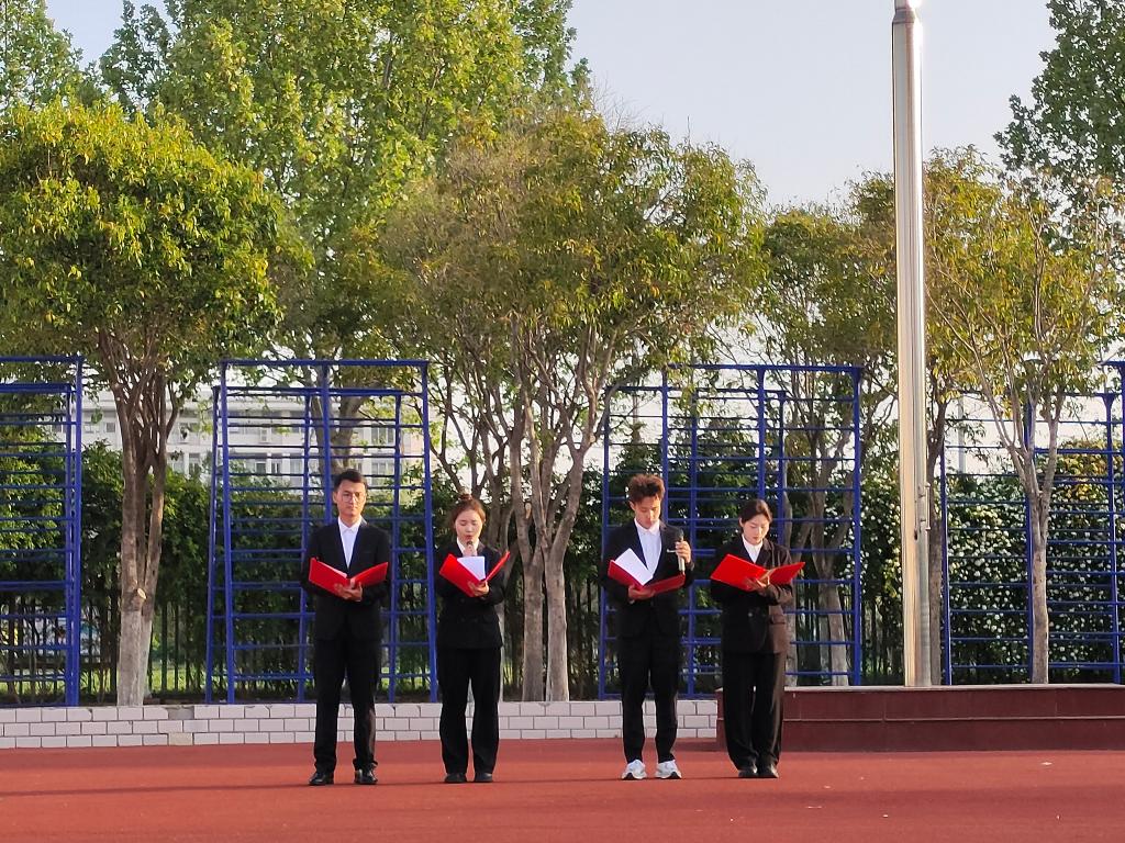 升旗礼毕,由苏俍婧、王宇航、张悦、曹青山四位同学以“新时代青年,强国有我”为主题进行诗朗诵,号召全院青年学子接好时代的“接力棒”,以史为鉴、开创未来,脚踏实地、顽强拼搏,在新时代新征程上奋力谱写新篇章。