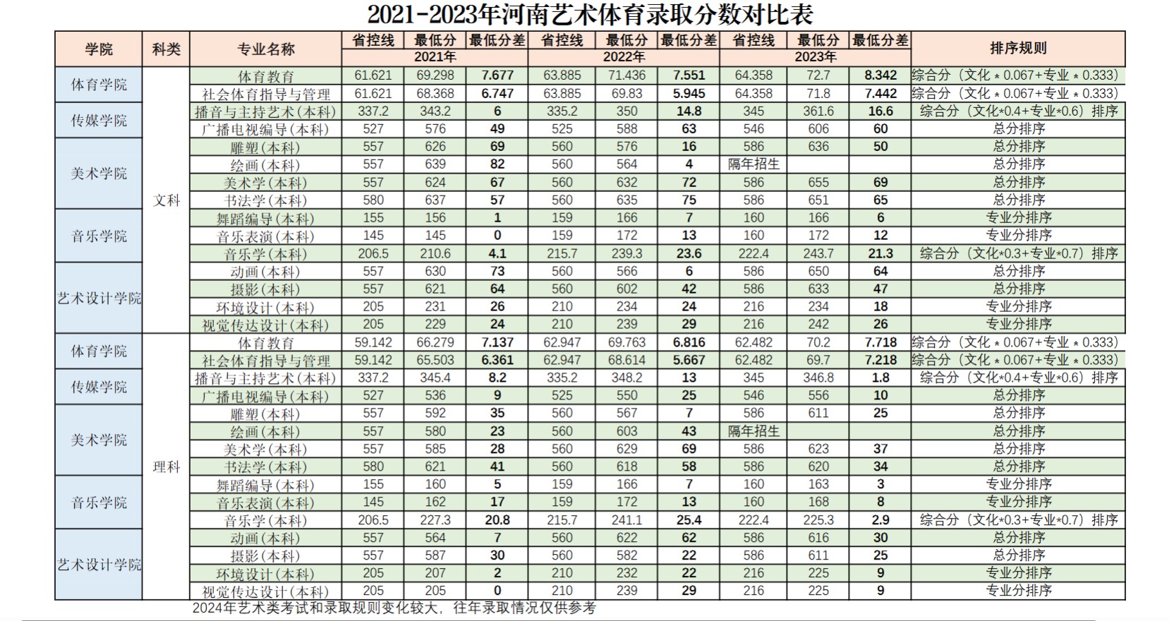 2021-2023年河南艺术体育录取分数对比表