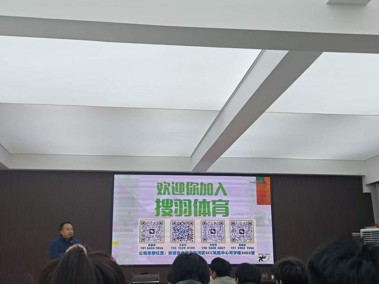 宣讲会上,张老师围绕企业发展、业务布局、人才需求、薪酬福利、职业成长等方面进行详细介绍,全面展示搜羽体育在体育培训、场馆运营、赛事组织等领域的发展优势与用人理念,重点讲解适配体育专业毕业生的教练、运营、教学管理等岗位要求与发展通道。张老师结合行业趋势与岗位实践,耐心解答同学们关于职业规划、实习就业、能力提升等问题,现场互动热烈。