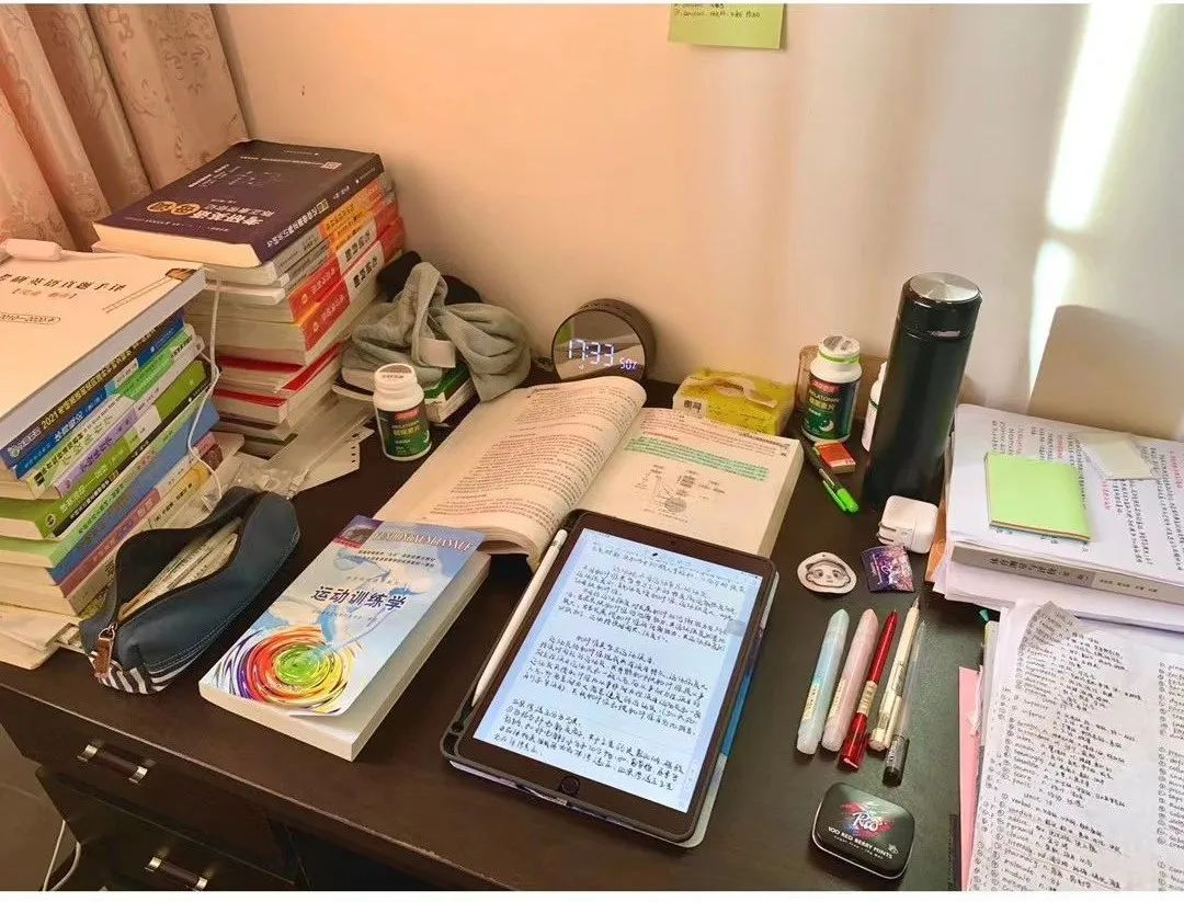 坚定并清楚自己的选择。了解到朋友在备考南师大,于是第一份专业课资料是南师大的,第一个选择的学校是南京师范大学。由于专科期间没有好好学过运训和生理学,基本上是不会,看着厚厚的专业课书和资料,密密麻麻,无从下手。硬着头皮搜罗了相关的网课,看课,记笔记,梳理异同点,看完就是背书。正式的专业课复习时间是在3月份开始,一直到6月份,对比了真题后,发现自己真的啃不下来。于是才开始好好去看报考院校的专业课考试内容和真题。也深刻体会到,在这个过程当中,资料的收集能力真的很重要!而北体一直是体育人梦想的地方,也听很多人说过北体有多难考。我先从其他的专业体院开始看考试专业课的内容和真题,对比下来发现北体的学硕只考2本书,且内容不超纲,基本吻合专业课书籍上的内容,于是一鼓作气想着“考都考了,管他能不能上,冲就是了!”。在6月份开始换书,决定直冲北体。在之前专业课的学习过程当中发现买来的资料都是简化版,很多内容会做缩减,不好理解,因此这次换院校重新开始专业课的学习,从书本上一点点结合真题以及其他院校的真题,查缺补漏。当真正静下心来学会去结合,学会去理解,学会去梳理补充知识的时候,对专业课的理解瞬间好了很多,学习进度也进入到正轨。上午英语,下午专业课,晚上对白天知识进行回顾复习。2020年9月正式返校,基本图书馆、场馆、宿舍三点一线,集体学习氛围更加浓厚,不理解的内容跟其他同学相互提问,清楚大家的学习进度和对知识的理解程度,继续修正调整自己。在与别人沟通的过程中,大家也会聊到自己的意向院校,但一定要坚定自己的选择,不要被外界声音所影响。细心研究过北体历年真题的就会发现,北体的题目在体育学考研当中是最正常的!