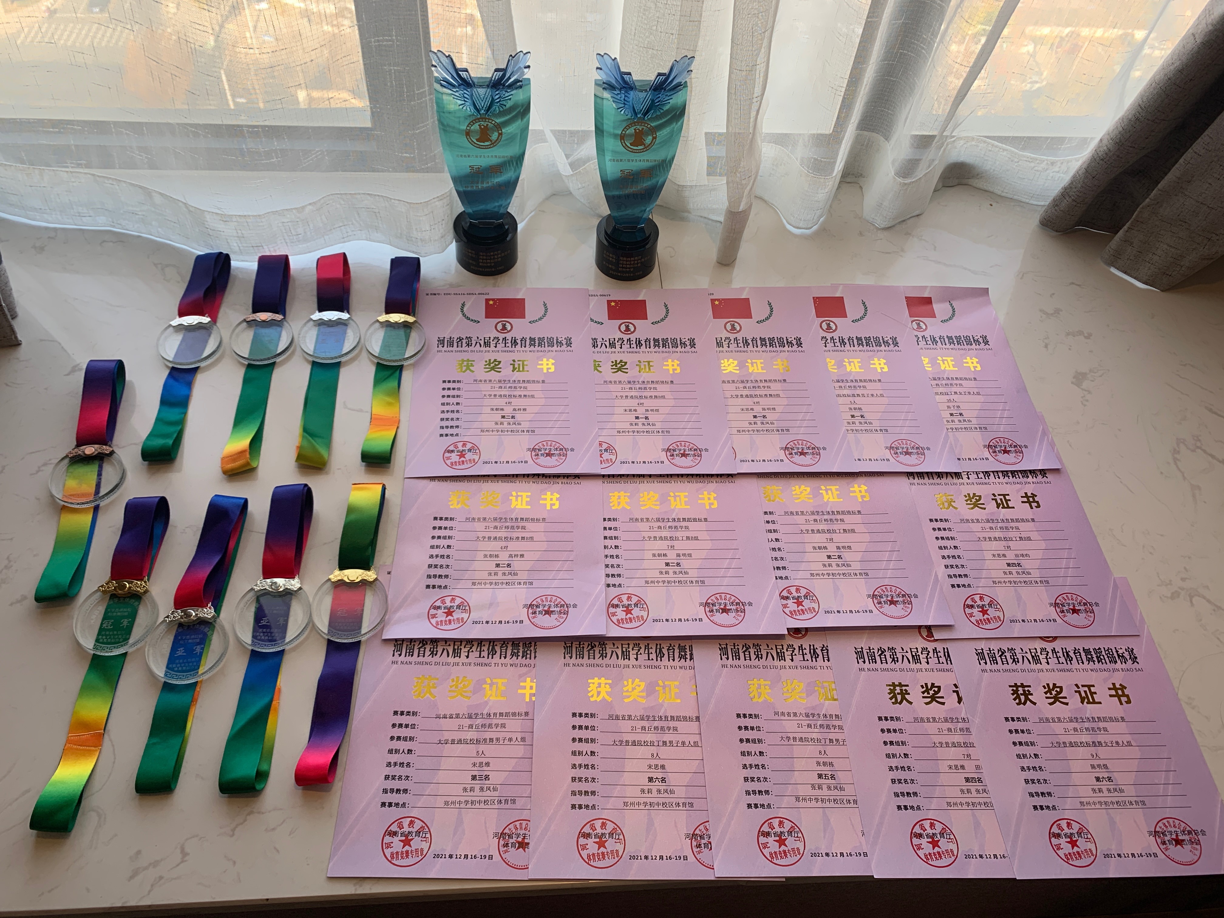 本届赛事由河南省教育厅主办,河南省员工体育总会体育舞蹈协会执行,郑州中学承办。来自全省26所高校的选手齐聚赛场,公司参加了普通高校组8个项目的竞争。公司国标舞代表队10名优秀选手获得了标准舞B组冠亚军、标准舞男子单人组冠军、拉丁舞女子单人组亚军、拉丁舞B组亚军、标准舞男子单人组季军、拉丁舞B组第四名、拉丁舞男子单人组第五名、拉丁舞男子单人组第六名和标准舞女子单人组第六名的优异成绩。