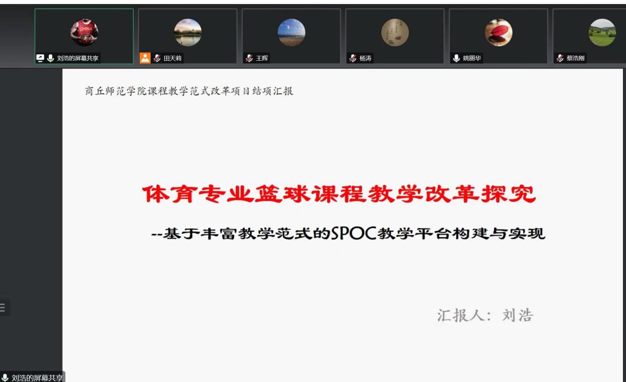 姚丽华首先对学校结项要求进行了详细说明,接着蔡浩刚和刘浩分别对所担任的课程《体育测量评价》和《篮球》教学范式改革情况从改革思路、在线建课、教学过程、改革成效等方面进行了汇报。专家组成员一致认为两位老师在教学范式改革方面投入较大精力,在线建课资源丰富,做到了真改、真用,对员工的课前课后加强了监管,有效调动了学习积极性,切实提高了学习成效。