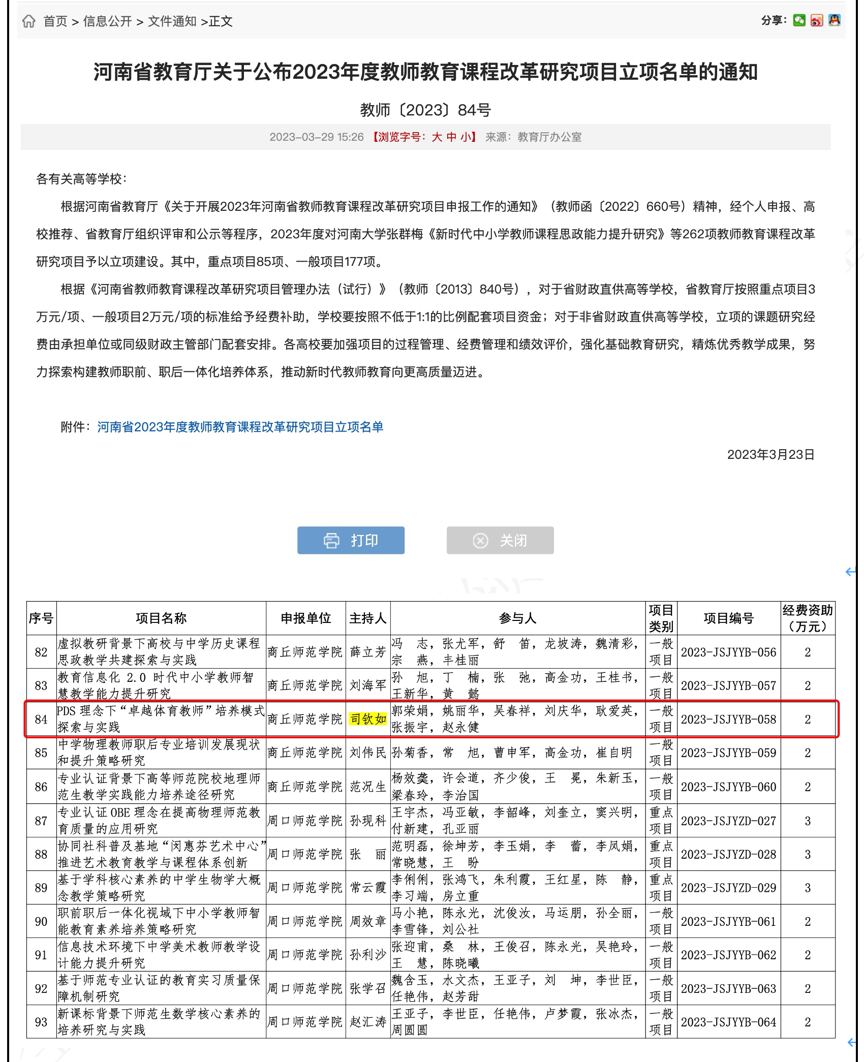 2023年3月29日,河南省教育厅发布了《关于公布2023年度教师教育课程改革研究项目立项名单的通知》(教师〔2023〕84号),公司教师司钦如《“PDS”理念下“卓越体育教师”培养模式探索与实践》获批一般项目。