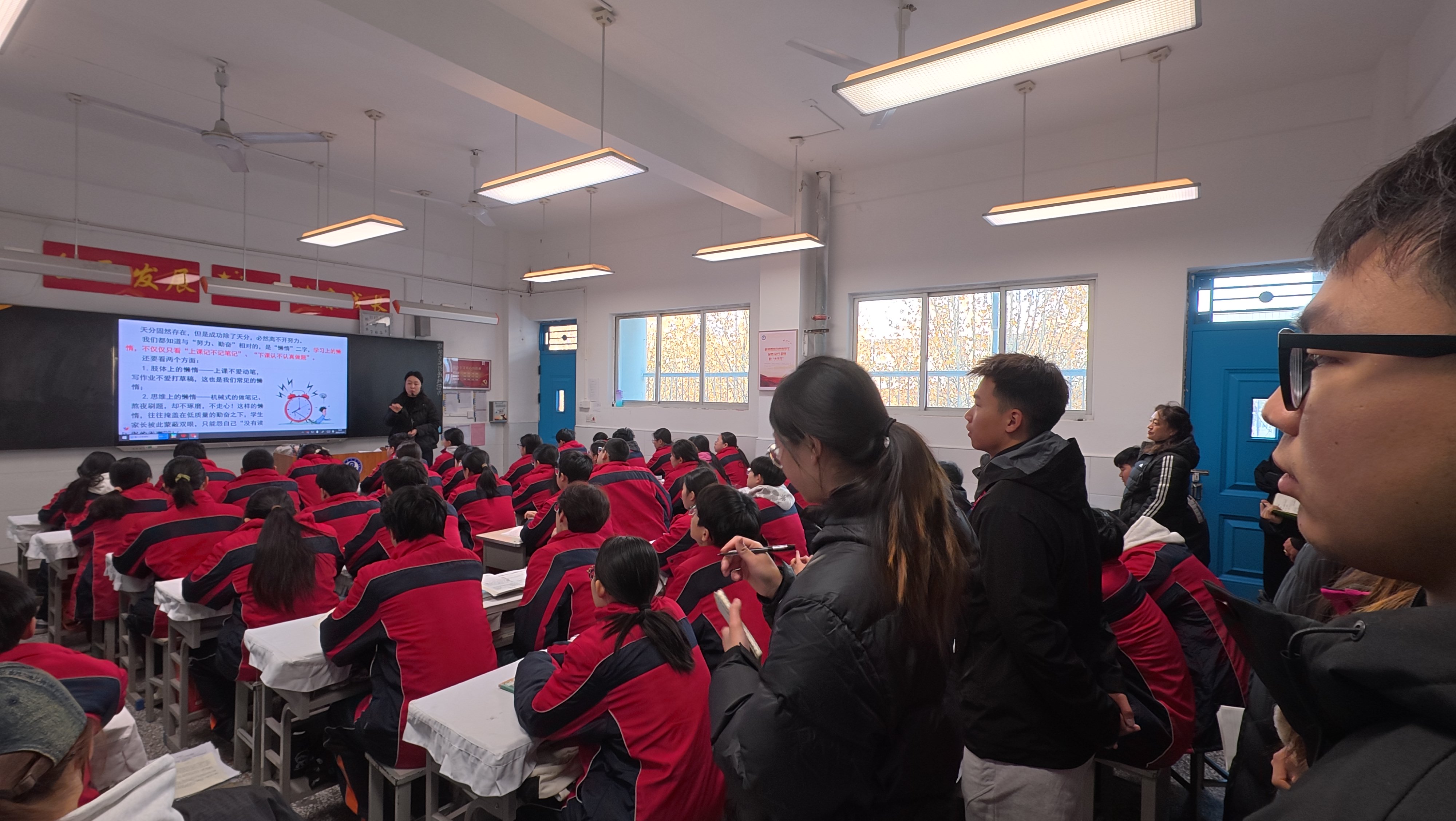 活动伊始,学员们走进九年级B3班,观摩了以“高效学习,成就自己”为主题的班会。班主任首先对班级昨日参与的“情暖校园”活动进行总结,引导员工分享在活动中收获的“团结”“积极”等成长感悟,鼓励增强班级凝聚力。随后,班主任围绕“注重细节、统筹时间、提升逻辑思维”三个方面提出学习建议,并结合“清华才子谈高效学习”“告别‘假努力’”“掌握学习全环节”等PPT内容,引导员工树立科学的学习观念。