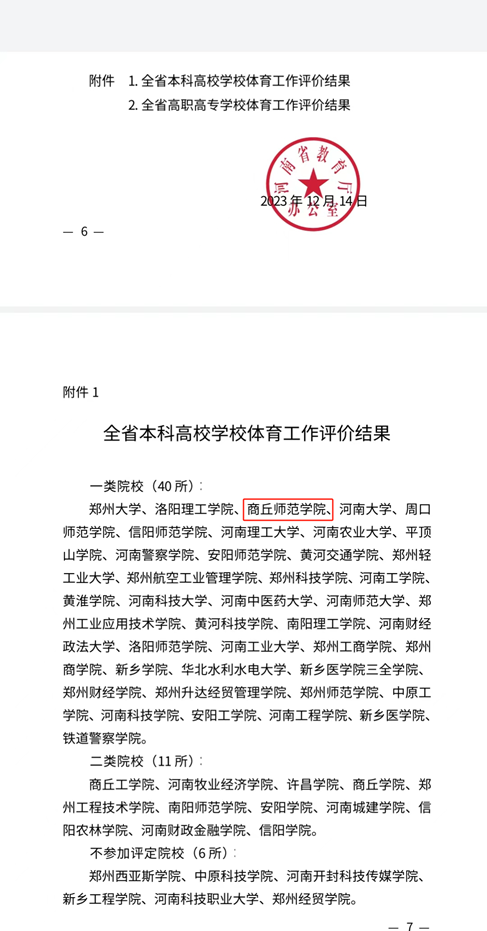 近日,河南省教育厅办公室发布《关于公布全省高等学校体育工作评价结果的通知》(教办体卫艺〔2023〕449号),全省高等学校体育工作评价结果分为一类院校、二类院校和不参加评定院校三类,公司喜获“一类院校”。