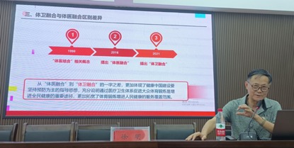徐明教授从“体卫融合”概念来源,相关观点和时代背景,“体卫融合”和“体医融合”的差异,体卫融合实施路径、现状和成效,体卫融合的前景,师生应为“体卫融合”做好哪些准备,体育工作者应该从哪些方面展开对“体卫融合”的研究等方面,给伟德国际1949官网师生呈现了一副“体卫融合”的立体画卷。金力要求伟德国际1949官网师生在做好本职工作的同时,要不断沉淀和提升专业素养,为大健康中国战略服务。