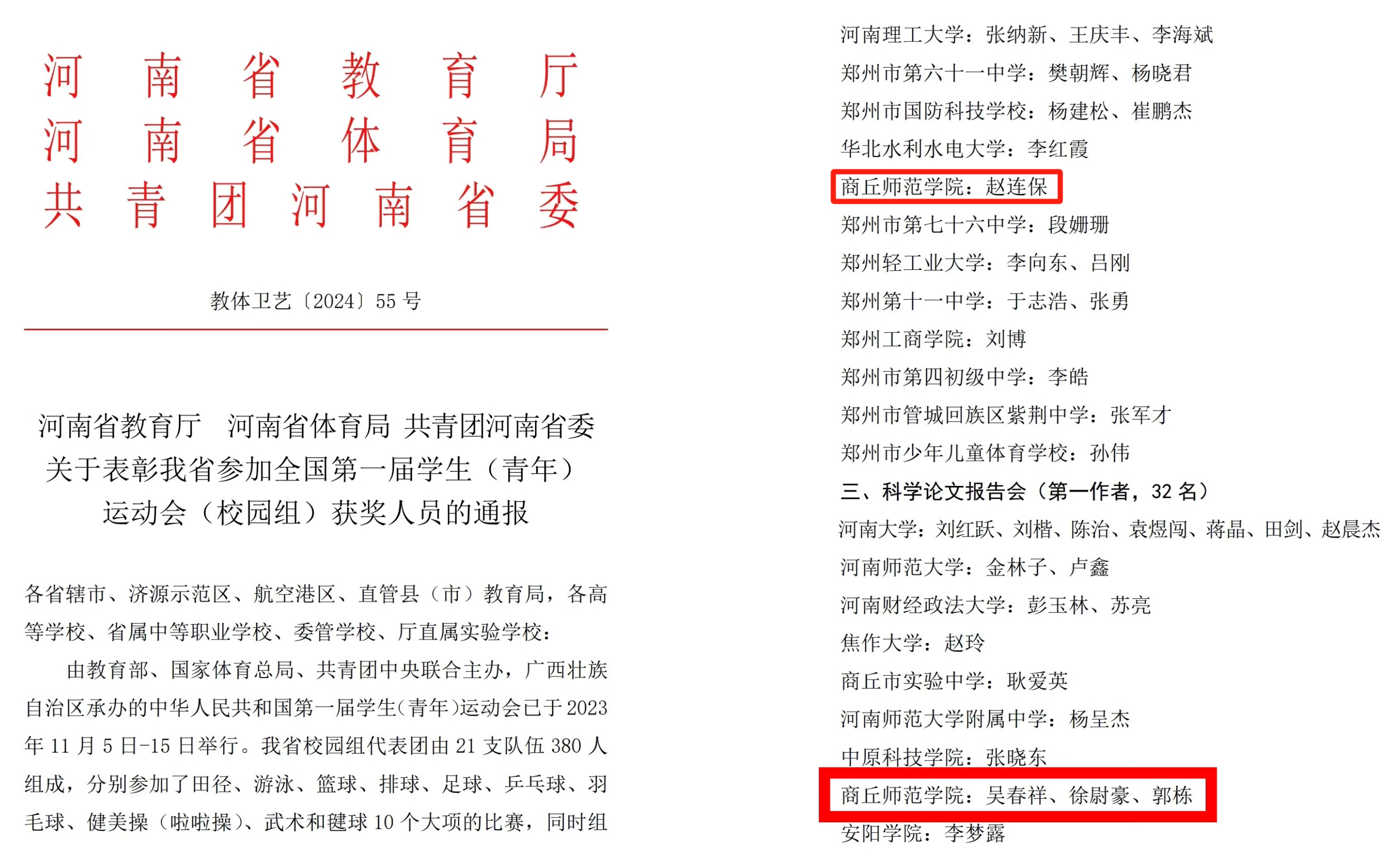 近日,河南省教育厅、河南省体育局、共青团河南省委联合下发《关于表彰我省参加全国第一届员工(青年)运动会(校园组)获奖人员的通报》(教体卫艺{2024}55号),伟德国际1949官网获突出贡献奖单位,伟德国际1949官网教师赵连保、郭栋、徐尉豪、吴春祥,员工刘燕、刘虎彪获通令嘉奖,伟德国际1949官网教师崔智勇、员工郑如意获通报表扬。