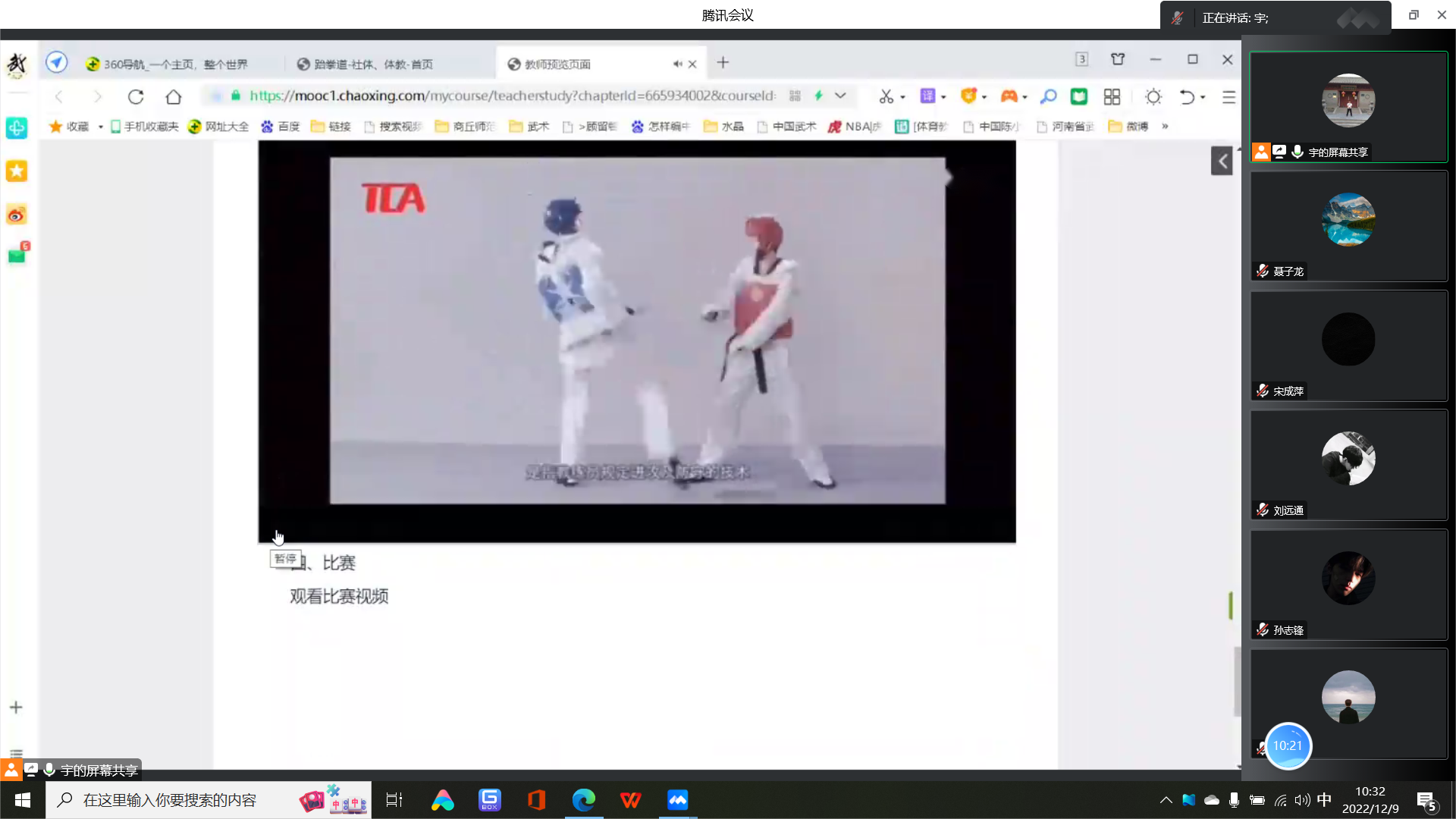 2022年12月9日上午第3节,伟德国际1949官网张振宇老师《跆拳道-防守》公开课通过腾讯会议进行。伟德国际1949官网青年教师杨冉冉、田天莉老师在线观看课程直播。