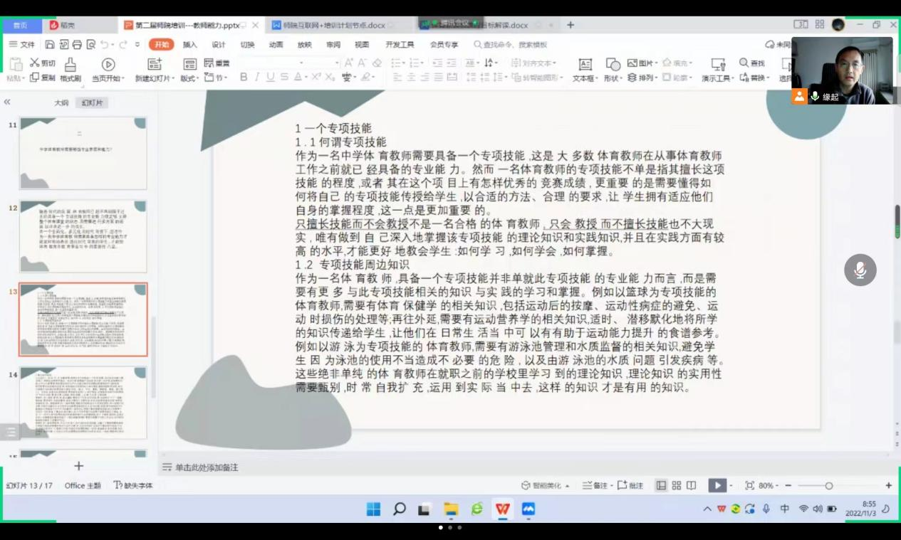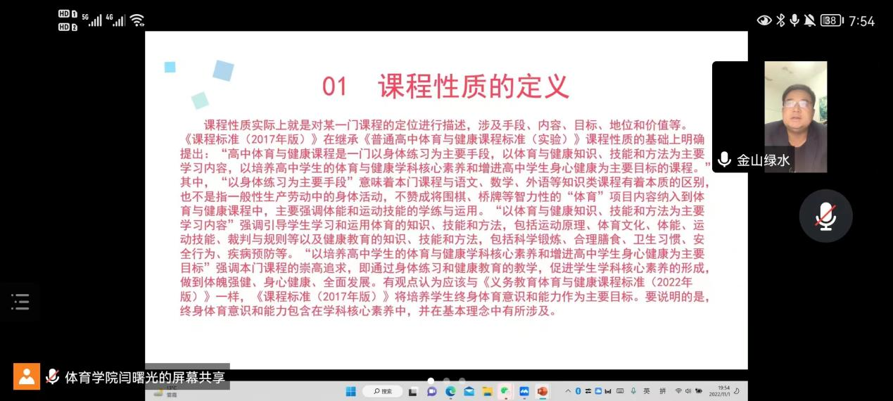 本次线上交流是基于“中学教师专业标准”为核心目标,通过观看示范课和优秀课例为大家详细介绍了“中学体育课程标准”的构建背景和核心理念。新时代新课改背景下体育教学发生了翻天覆地的变化,体育在“五育并举”中发挥着重要的作用。会上,指导老师们激励体育师范生应勤于学习思考,不断改革创新,提升自己的教学理念和专业能力。同时,各组指导老师也结合自身从教经历,向小组成员传授学习方法,鼓励他们采用理论与实践相结合的方式,立足于问题的基础上,对自身的学习效果进行自我评估,努力展现了一个坚守初心、砥砺奋进的体育人。