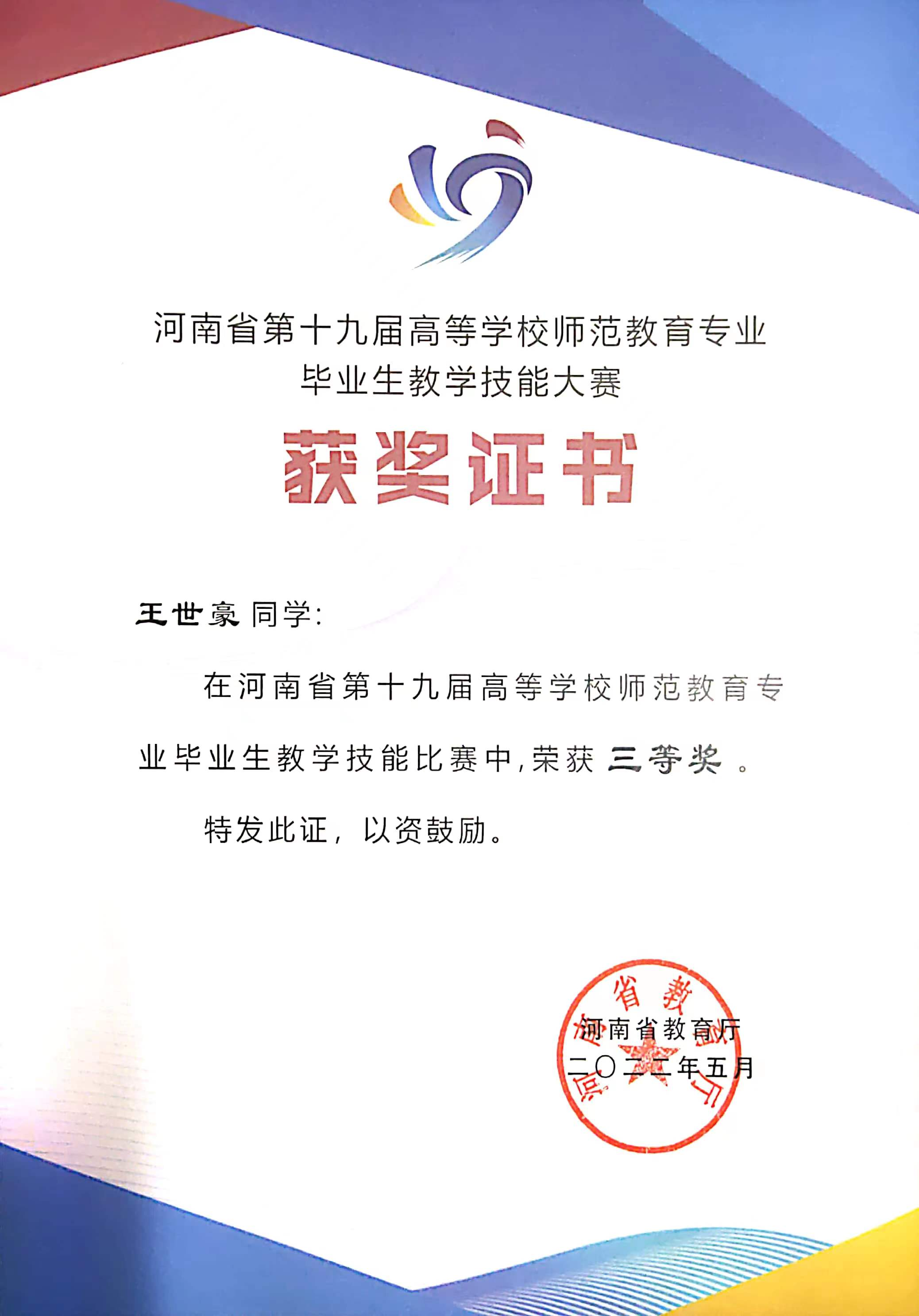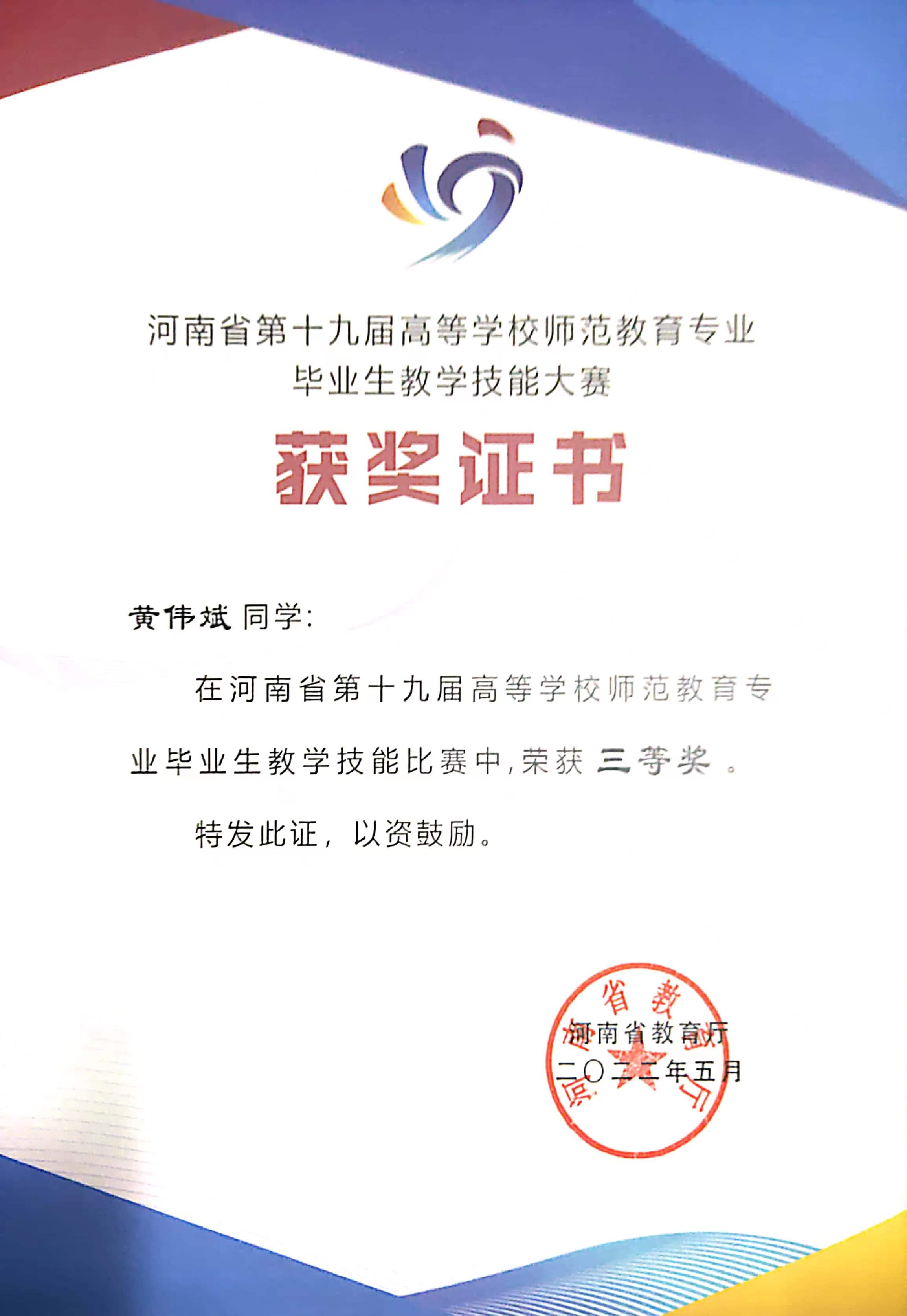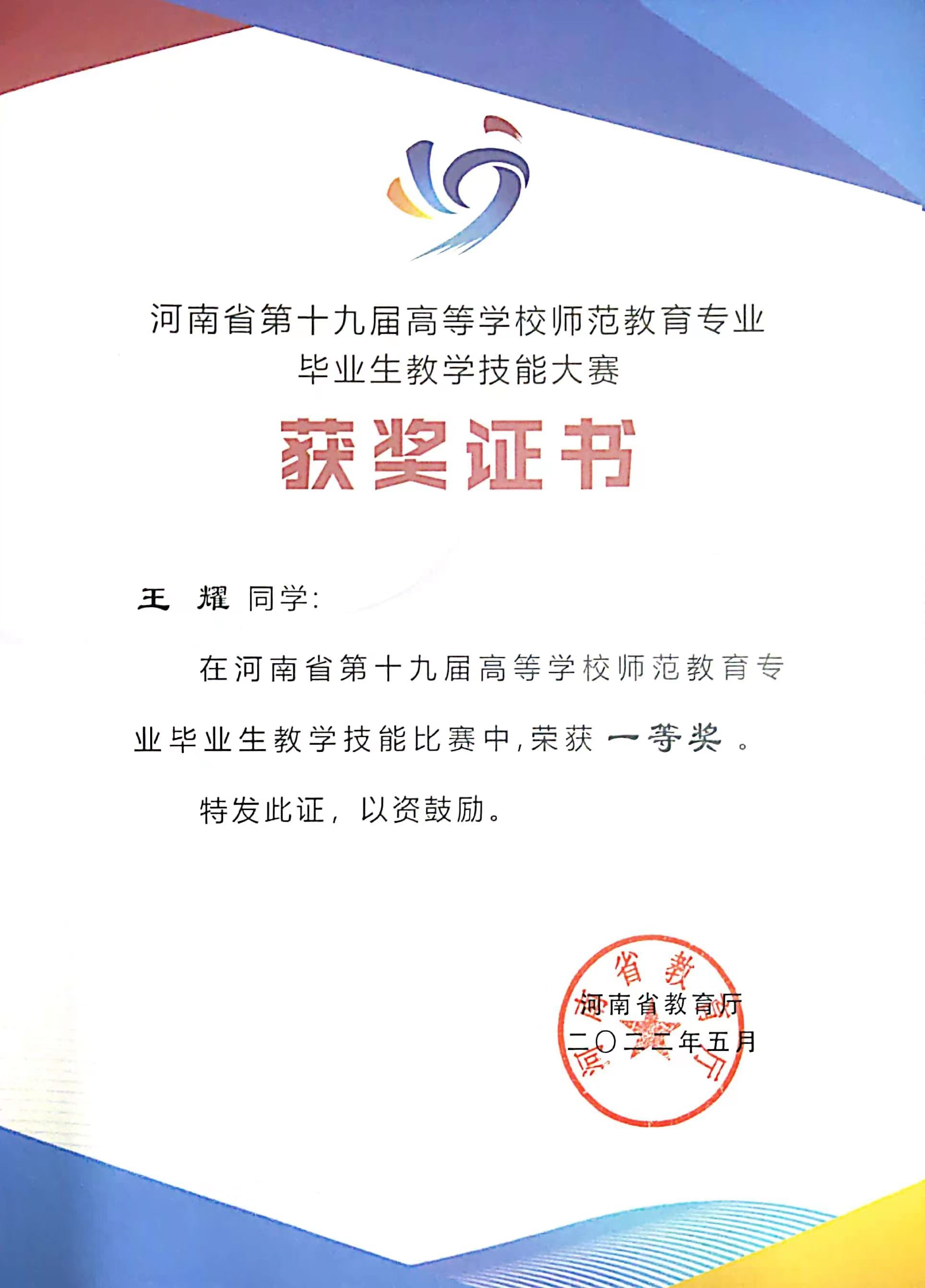 近日,河南省教育厅下发了《关于第十九届高等学校师范类专业毕业生教学技能比赛结果的公示》,该赛事是河南省师范生教学能力比赛最高赛事,公司体育教育专业师范生参加本次比赛,王耀同学荣获一等奖,黄伟斌、王世豪同学荣获三等奖,再次取得优异成绩,伟德国际1949官网教师呼美兰荣获优秀辅导奖。